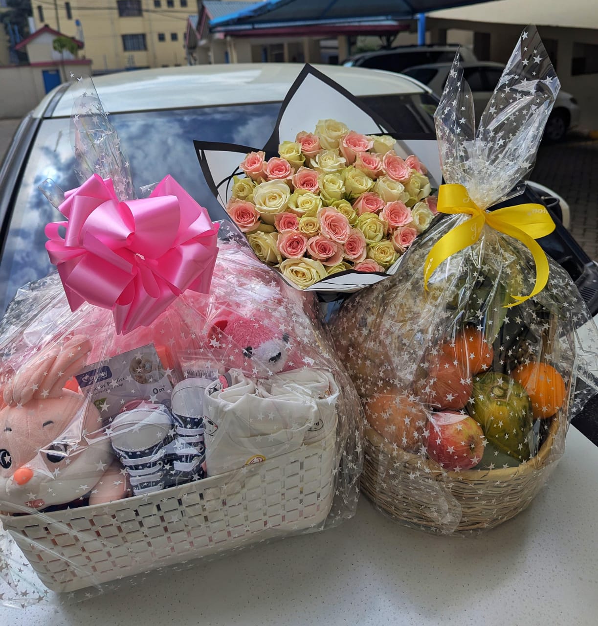 3. A baby hamper with baby cloths, toys and baby accessories.