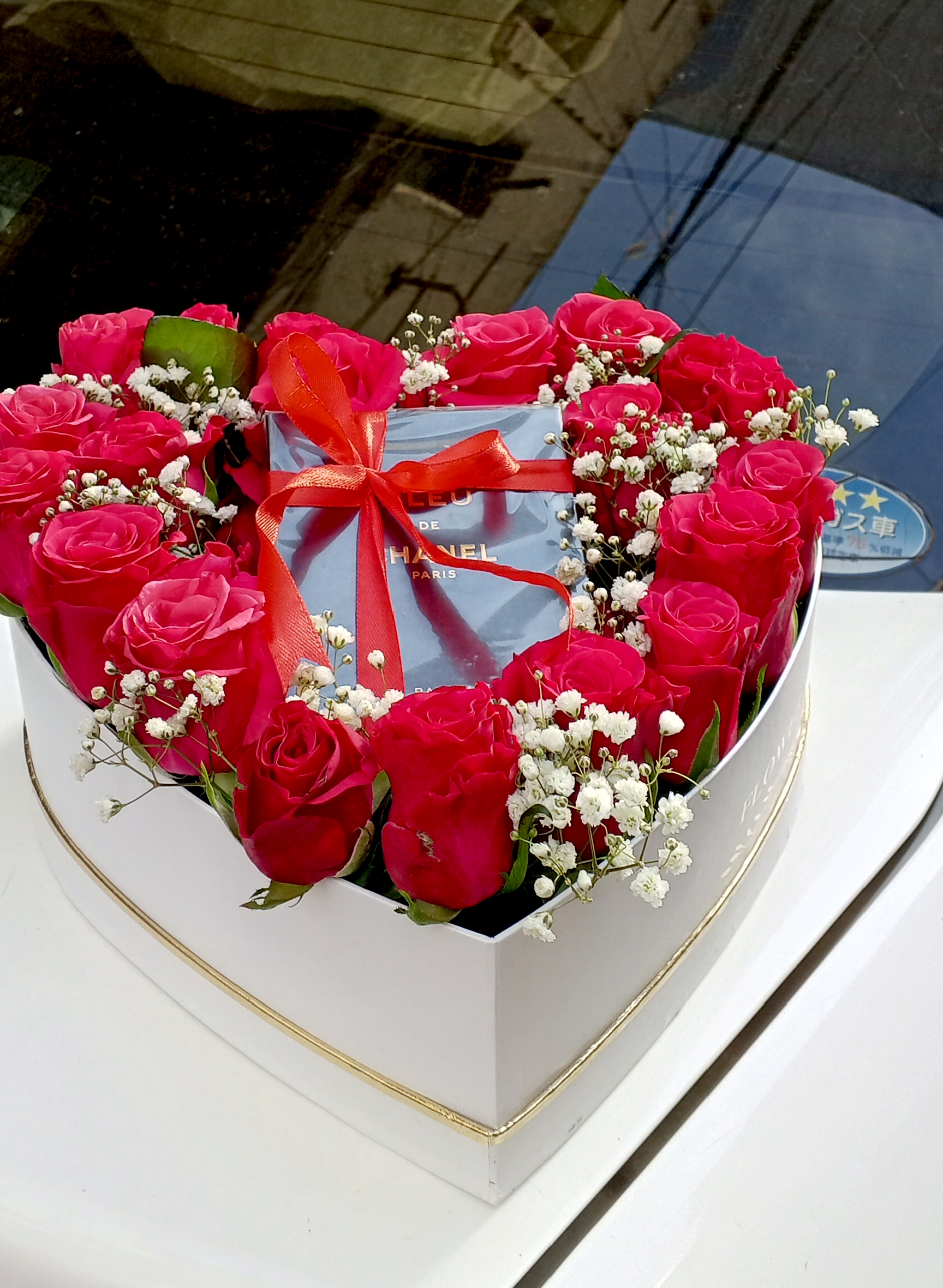 - A heart shaped flower box bouquet with red roses and baby breaths.