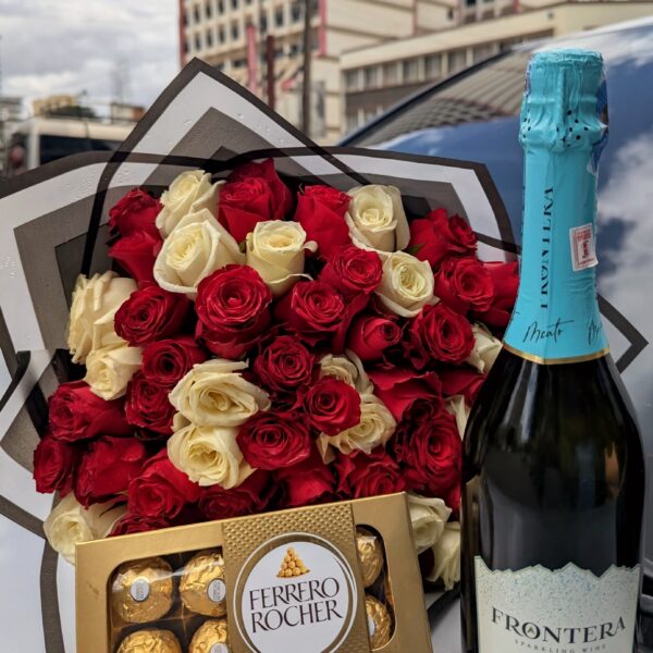This gorgeous flower bouquet is a mix of red and white roses, lilies and baby breaths. Perfectly combines to make a stunning masterpiece.