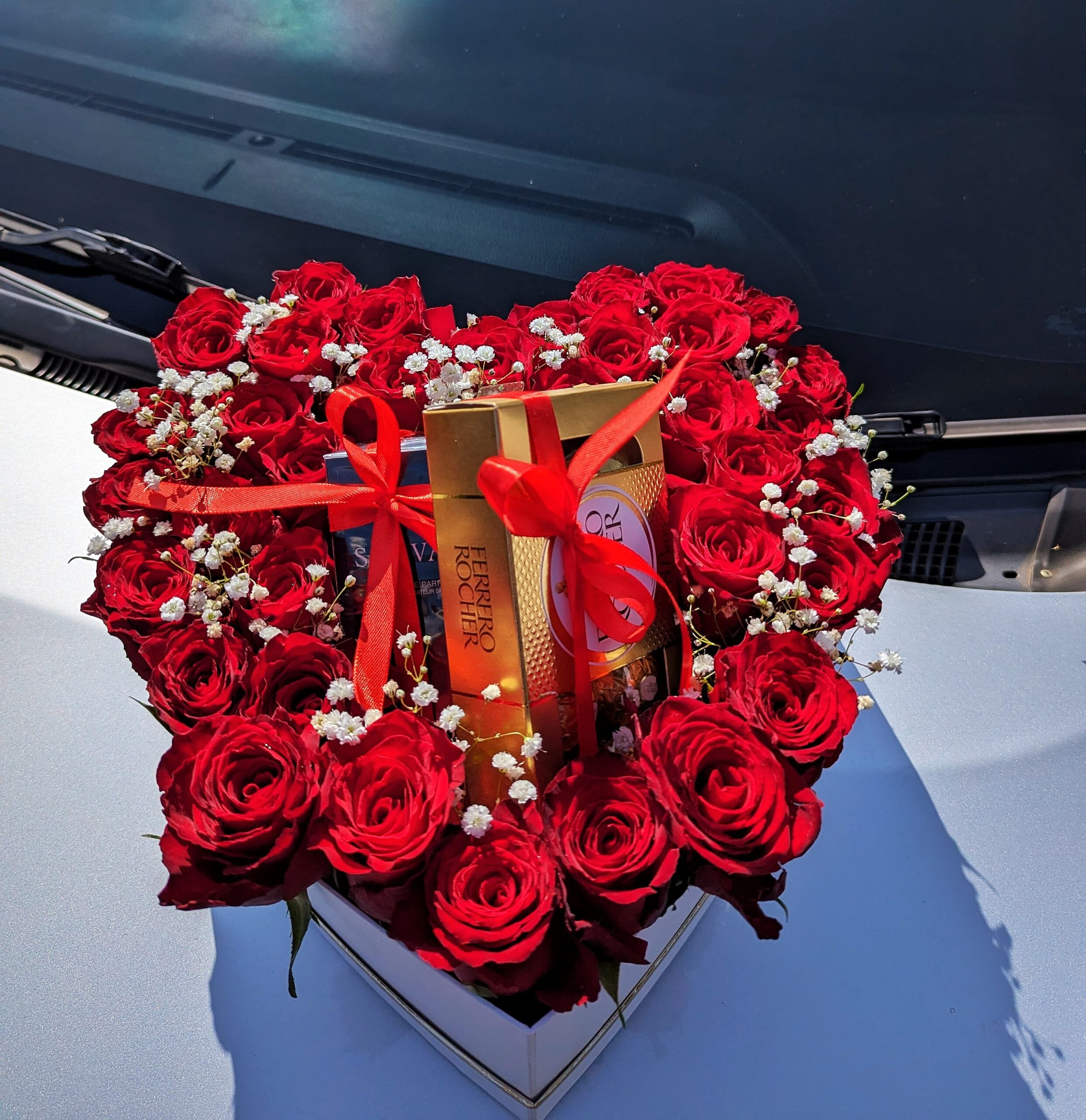 - A heart shaped flower box arrangement with red roses and baby breaths.